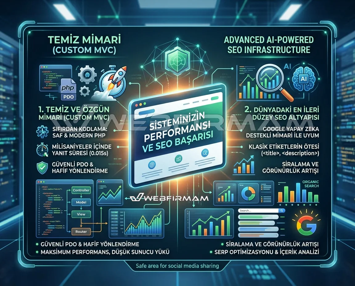 Webfirmam Web Tasarım & Programlama Hizmetleri’nin yıllara dayanan yazılım tecrübesi ve profesyonel ekibi tarafından geliştirilen özel yazılım mimarisi sayesinde, kullanıcılarına yüksek performanslı, güvenli ve kullanıcı dostu bir deneyim sunuyor...