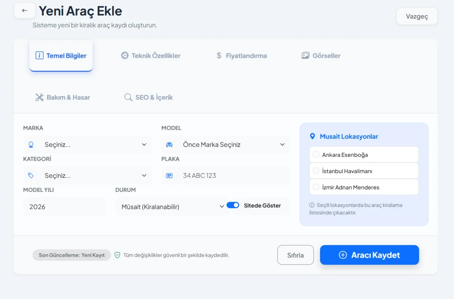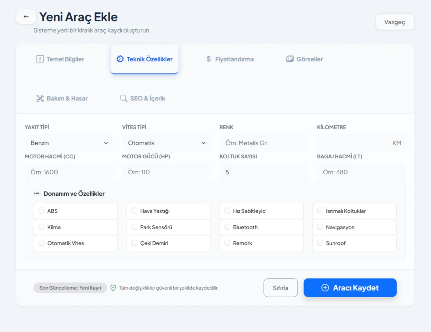 - Araç Yönetimi (Teknik Özellikler, Fiyatlandırma, Bakım ve Hasar Kayıtları)