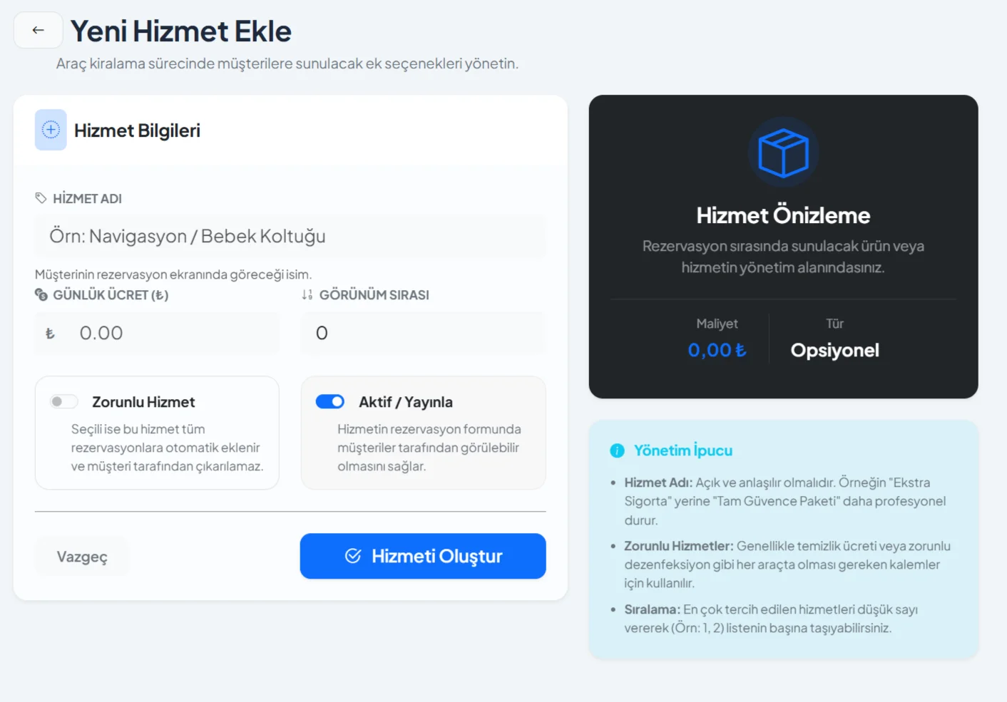 - Ekstra Hizmetler Yönetimi